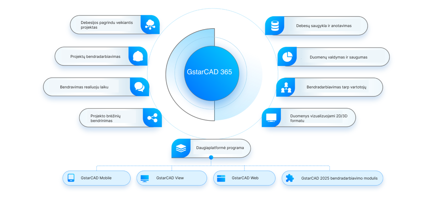 Įmonės gali naudoti visas „GstarCAD 365“ programas ir paslaugas viešajame debesyje, mėgaudamosi greitu reagavimo laiku ir dideliu lankstumu, užtikrindamos stabilumą, saugumą ir sklandų verslo veikimą.