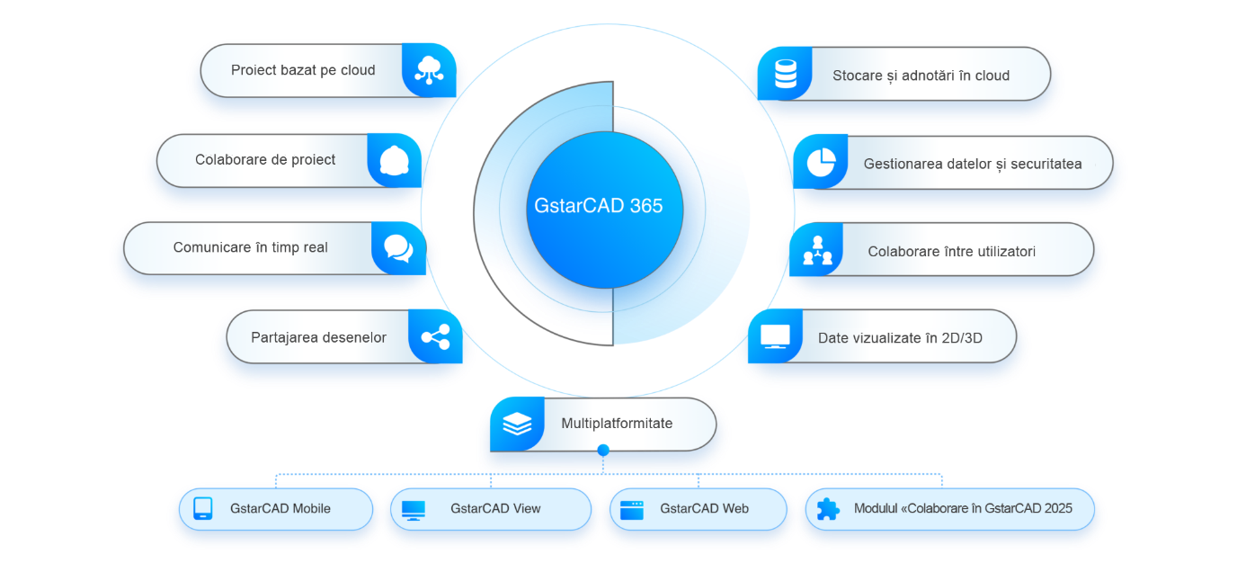 GstarCAD 365 este o soluție bazată pe cloud care permite colaborarea pe mai multe platforme și în echipă, permițând utilizatorilor să vizualizeze, să proiecteze și să gestioneze desene de oriunde.
